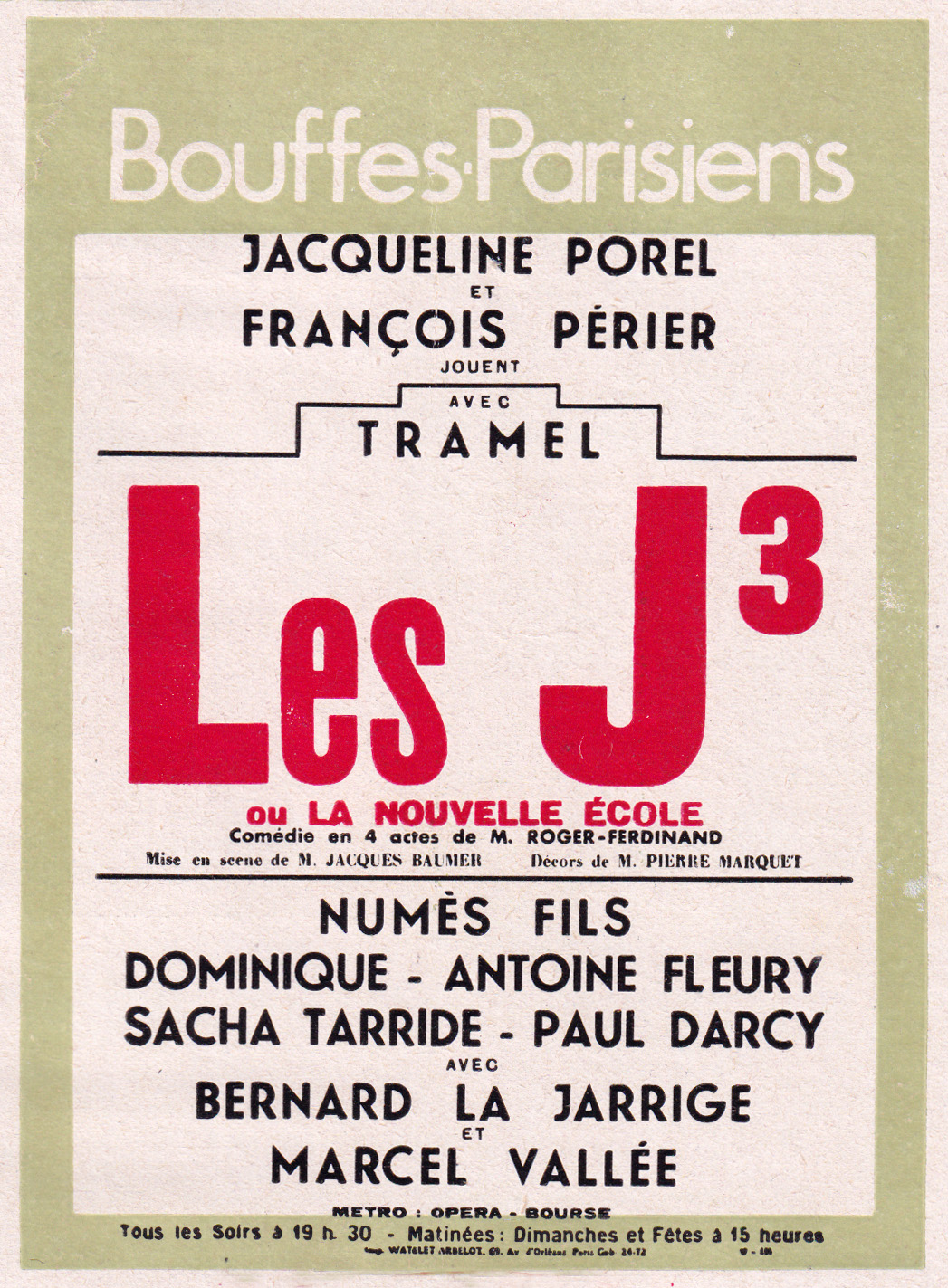| Interprétation | Jacqueline Porel (Mlle Bravard) puis Simone Barillier |